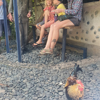 He then led us through to his garden. Completely covered in cats (he estimated 60) and chickens (cats for the rats, and chicken for the centipedes), he sent Will up the pamplemousse tree and gave us those, plus pomegranates to take home. While Will was up the tree, he decided to teach Lisa some self-defence. Saying a fond farewell, we all left feeling completely baffled.